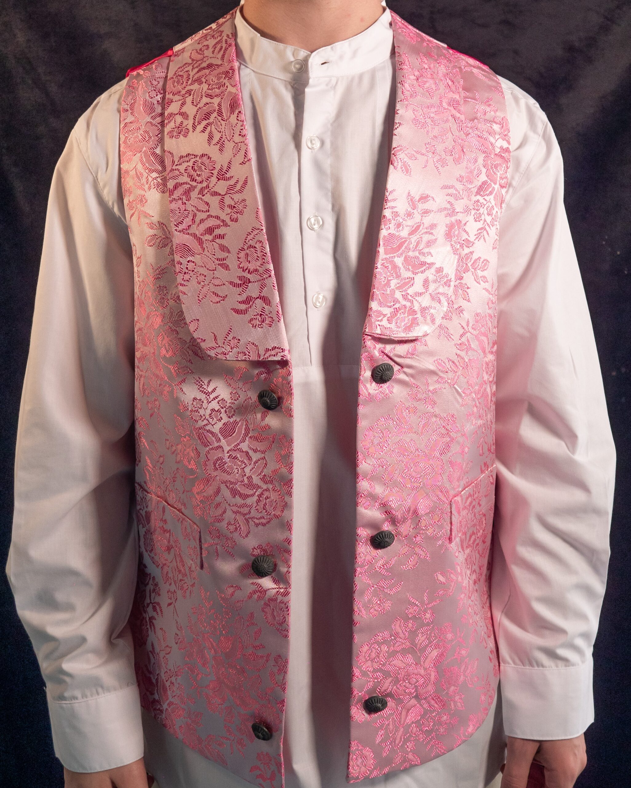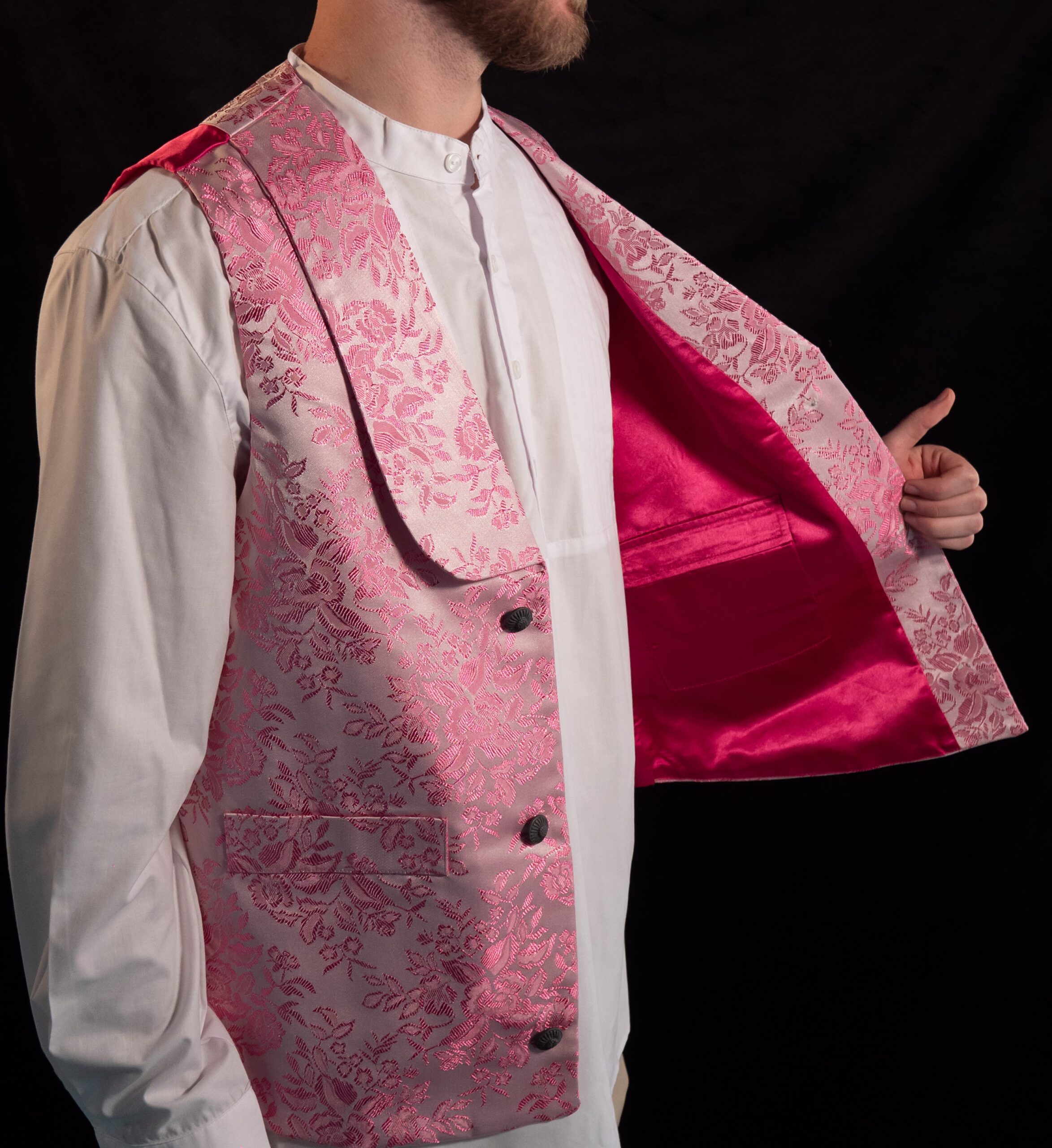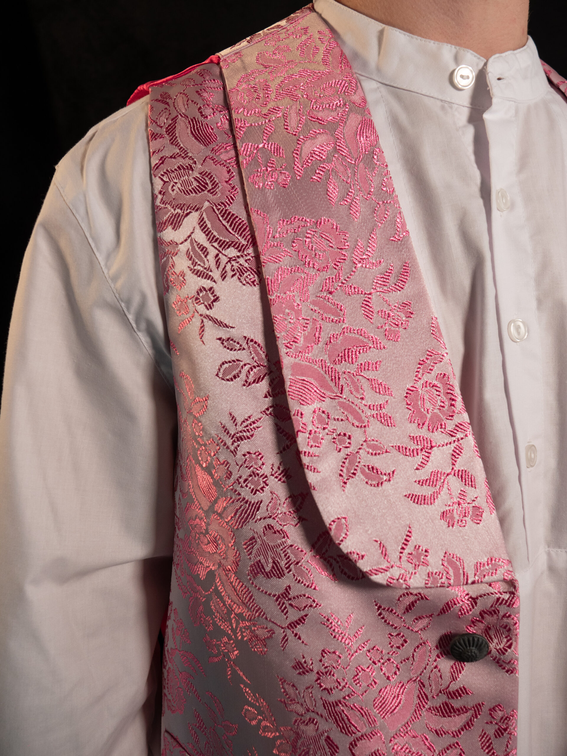 Chaleco brocado con delicado diseño de flores, inspirado en la indumentaria tradicional de la Región de Murcia. Su tejido brocado aporta riqueza visual y sofisticación, convirtiéndolo en una pieza protagonista dentro del conjunto regional.