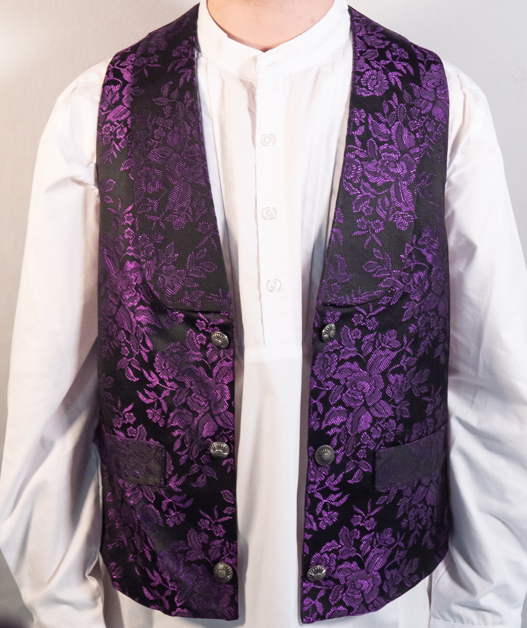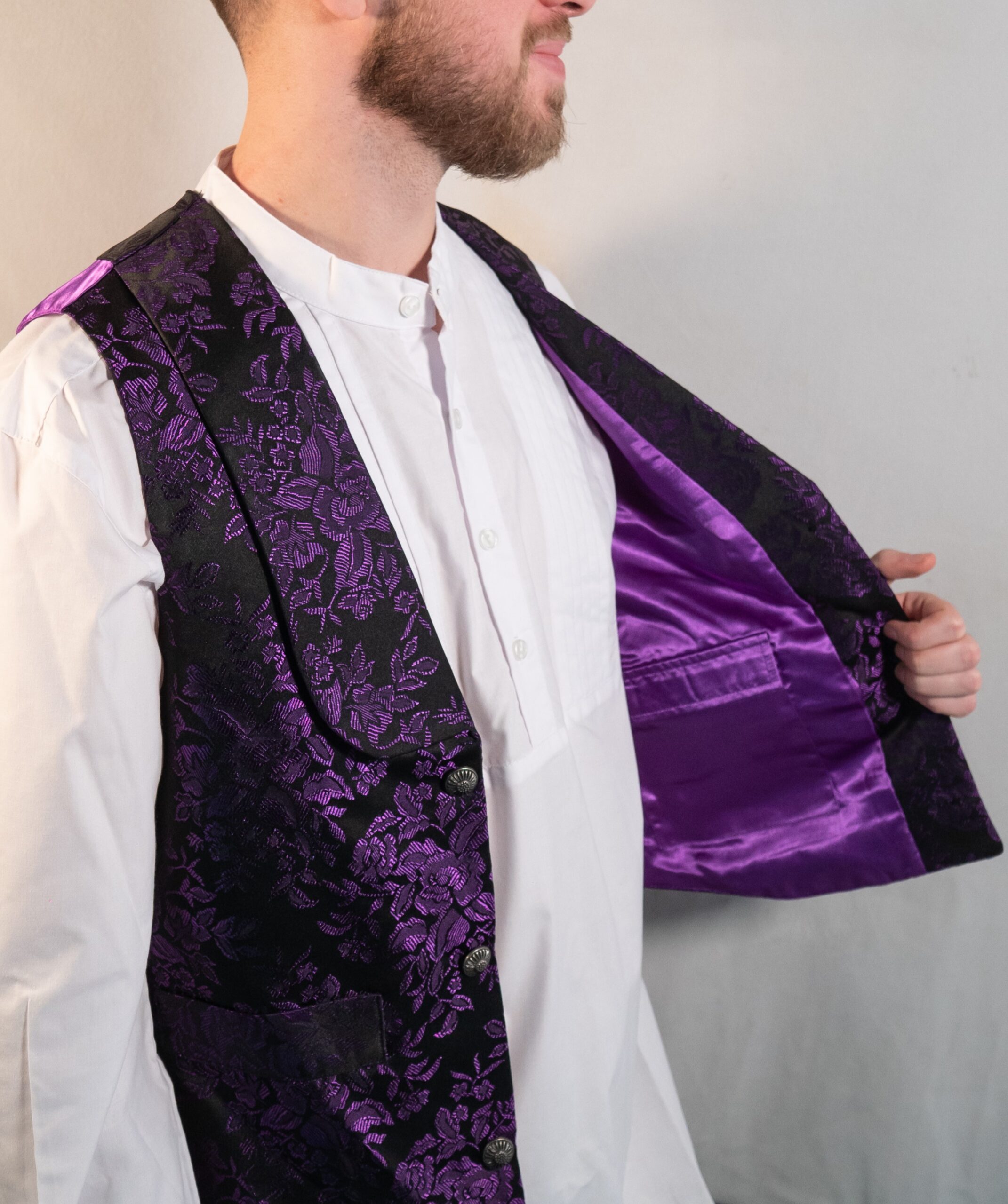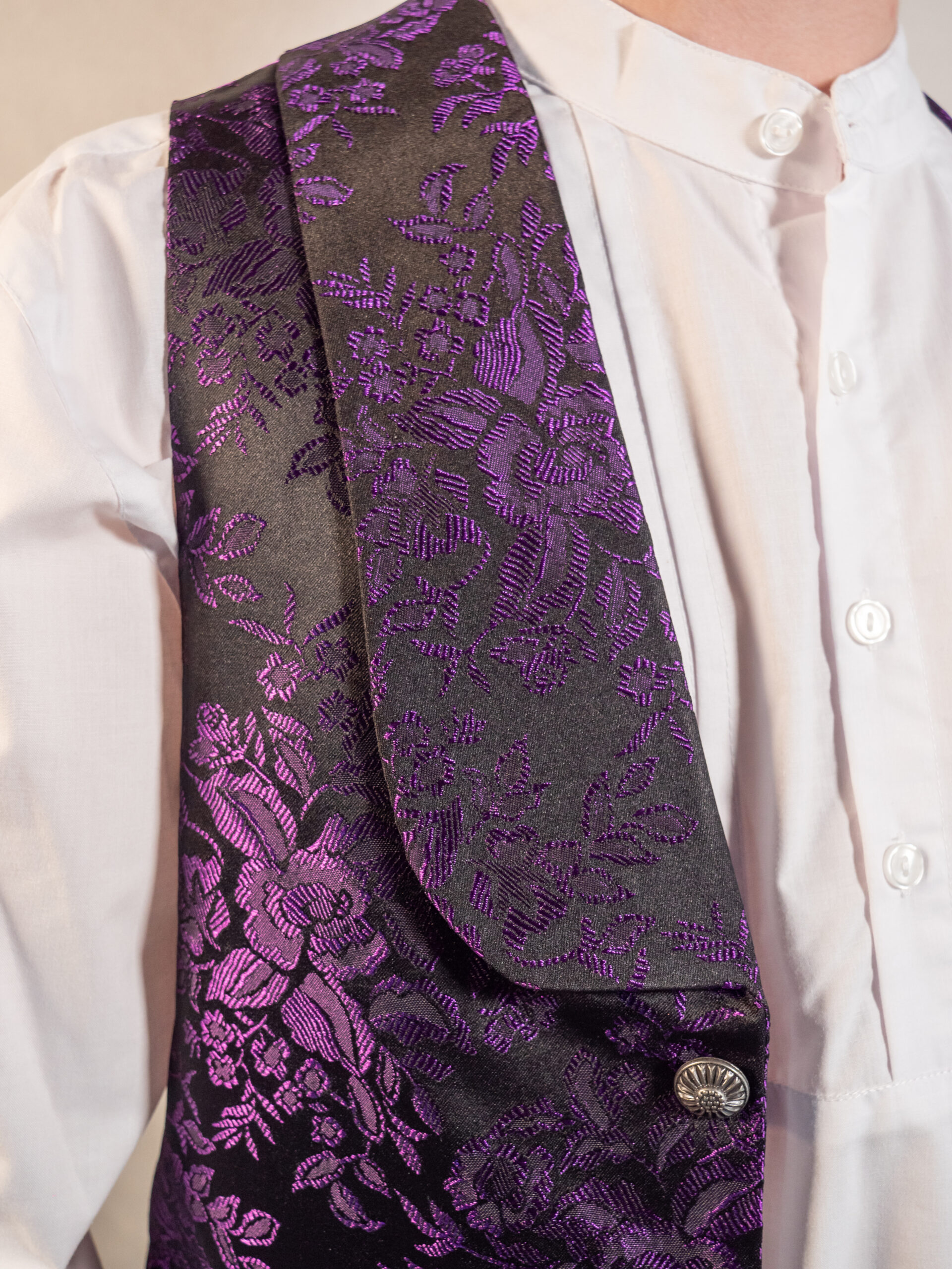 Chaleco brocado con delicado diseño de flores, inspirado en la indumentaria tradicional de la Región de Murcia. Su tejido brocado aporta riqueza visual y sofisticación, convirtiéndolo en una pieza protagonista dentro del conjunto regional.