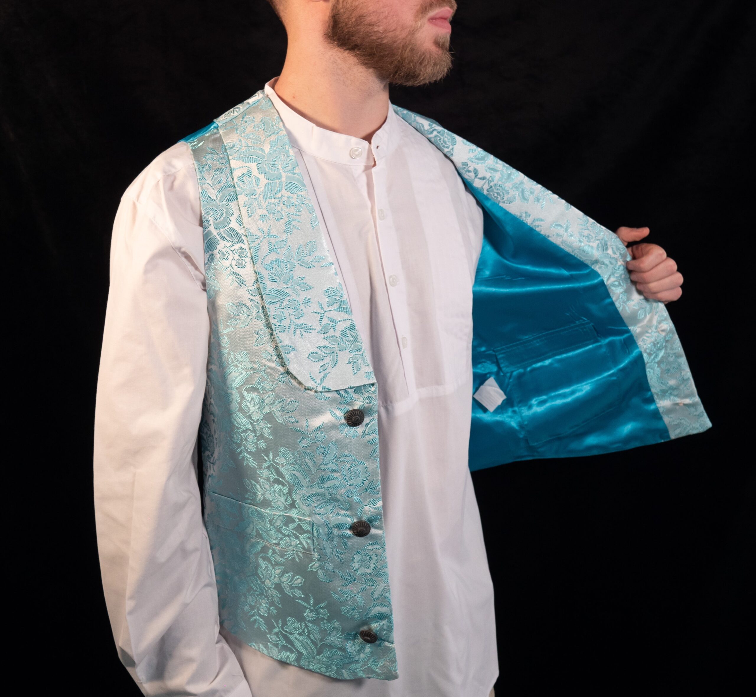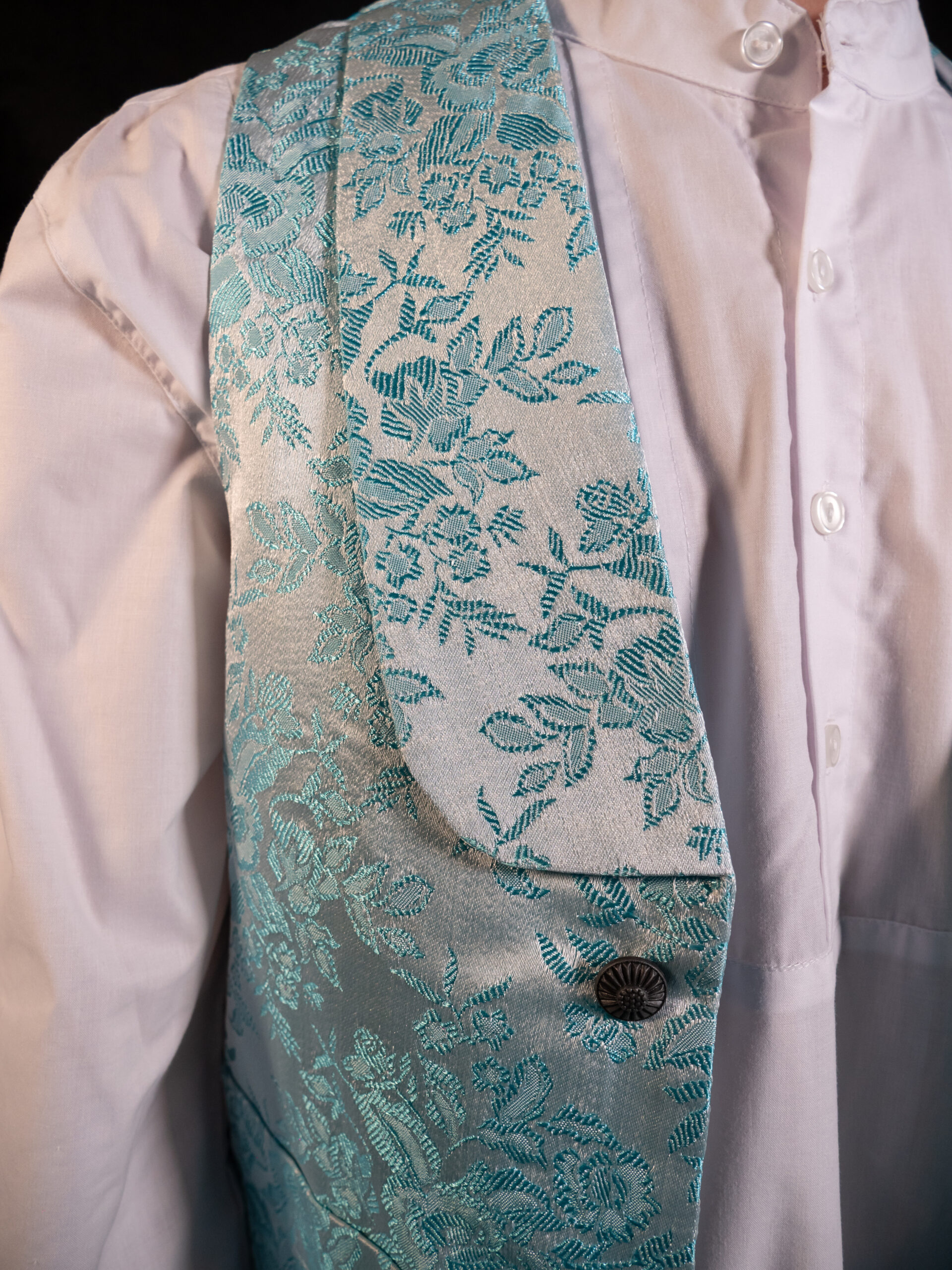 Chaleco brocado con delicado diseño de flores, inspirado en la indumentaria tradicional de la Región de Murcia. Su tejido brocado aporta riqueza visual y sofisticación, convirtiéndolo en una pieza protagonista dentro del conjunto regional.