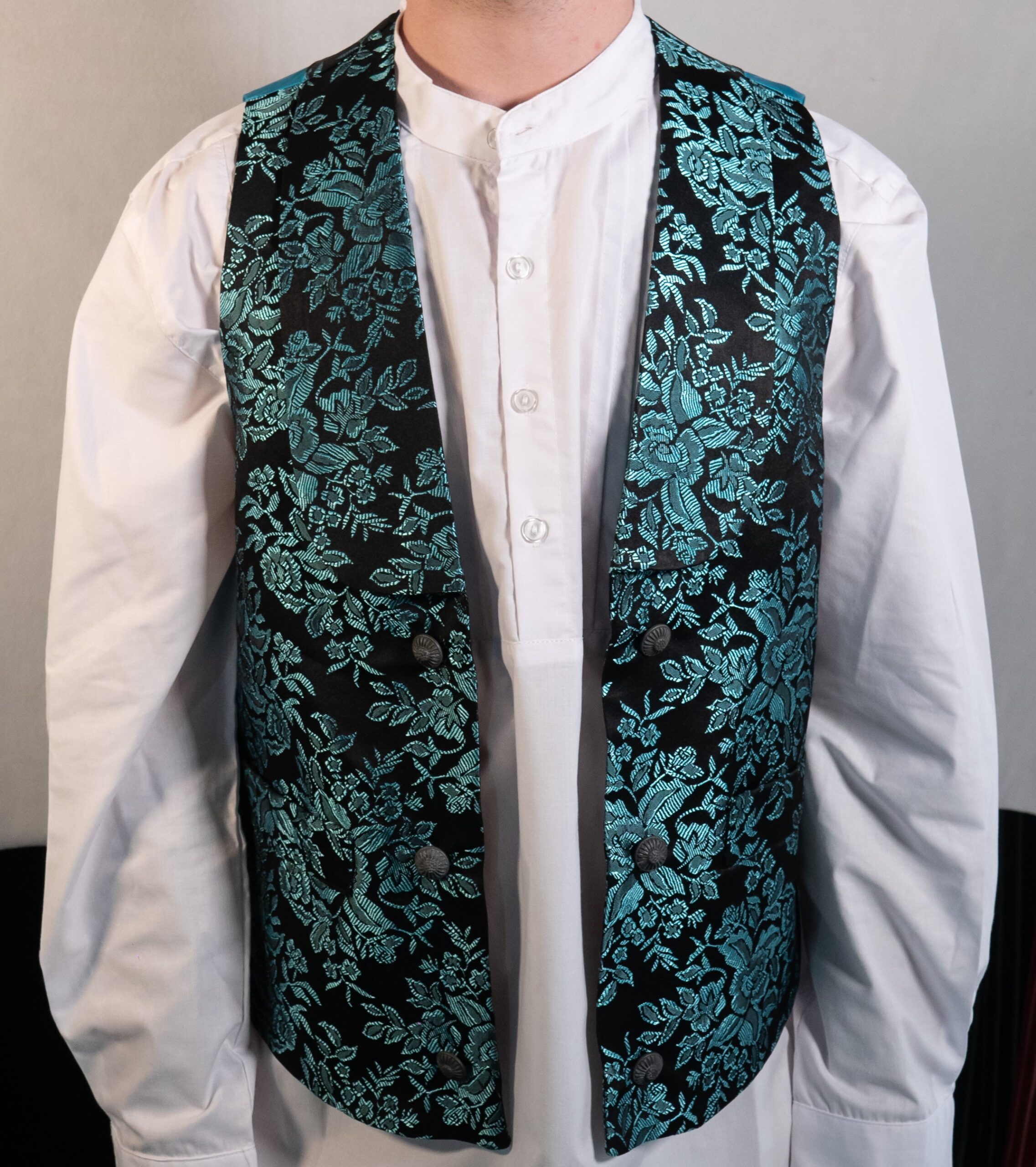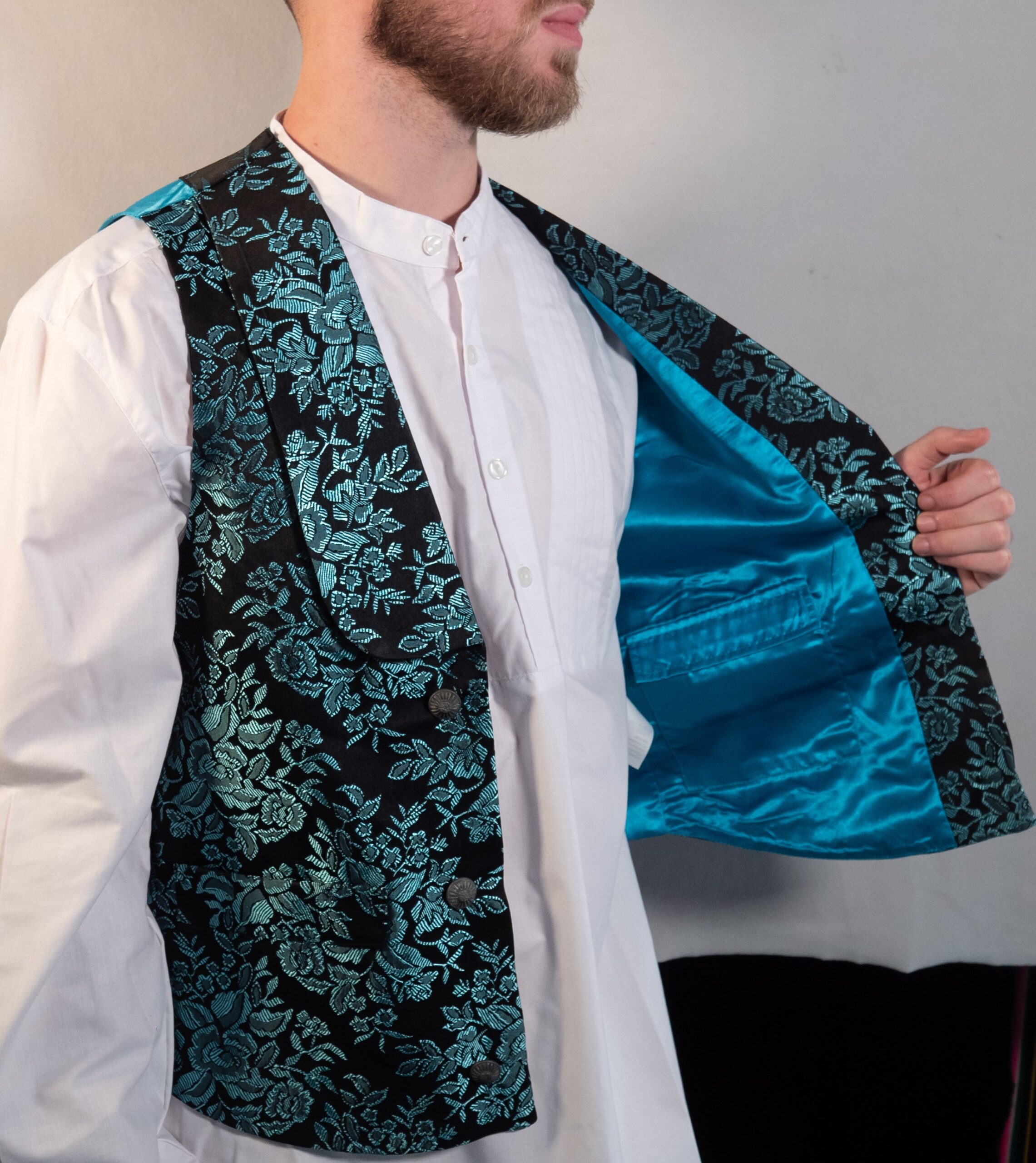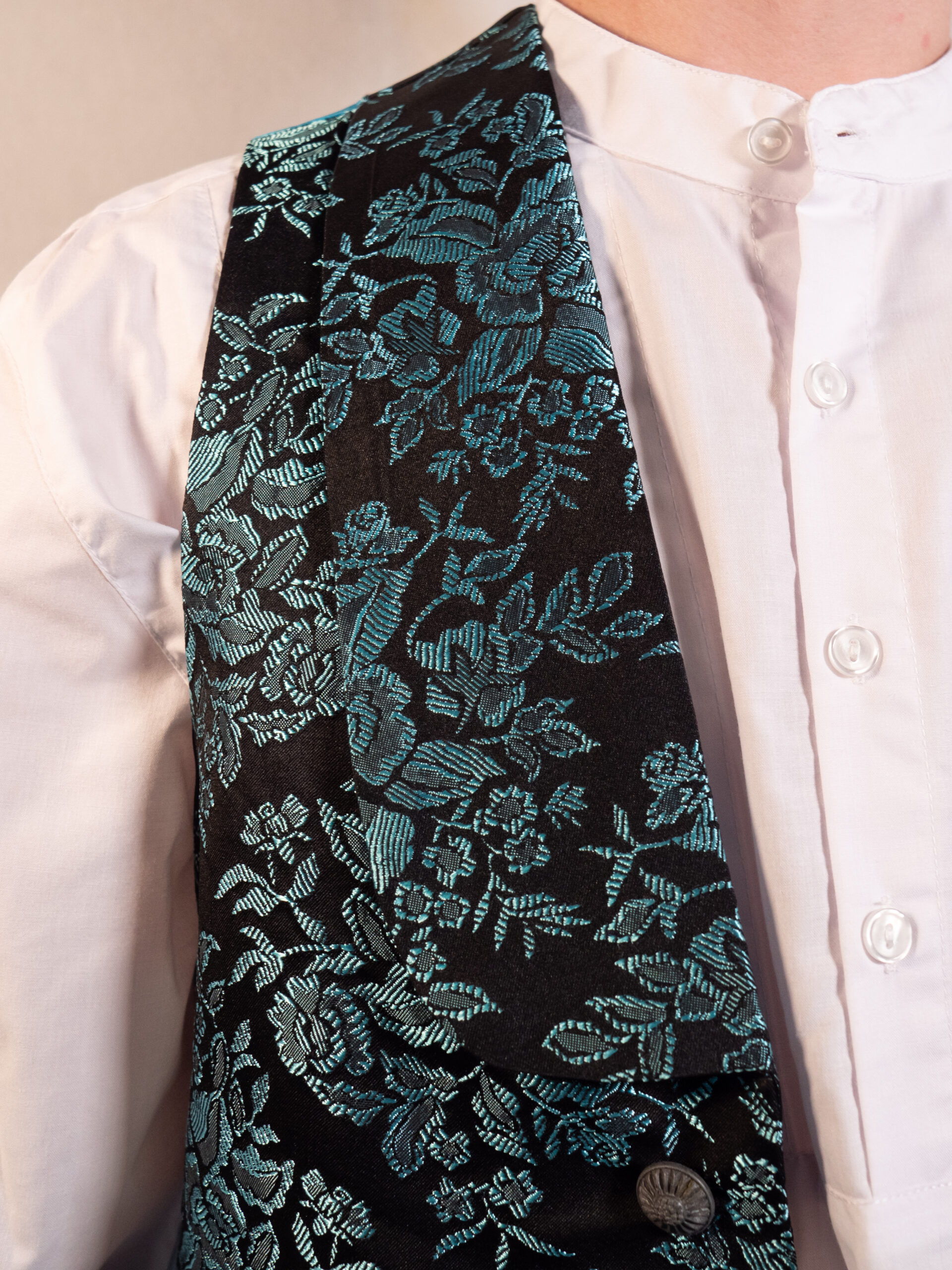Chaleco brocado con delicado diseño de flores, inspirado en la indumentaria tradicional de la Región de Murcia. Su tejido brocado aporta riqueza visual y sofisticación, convirtiéndolo en una pieza protagonista dentro del conjunto regional.