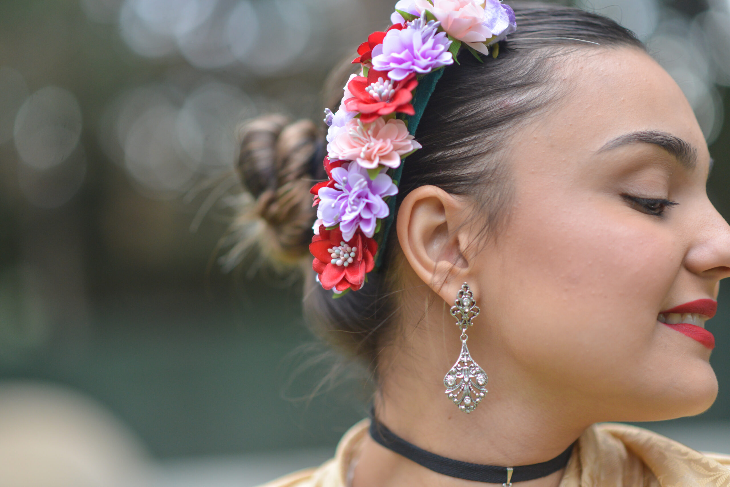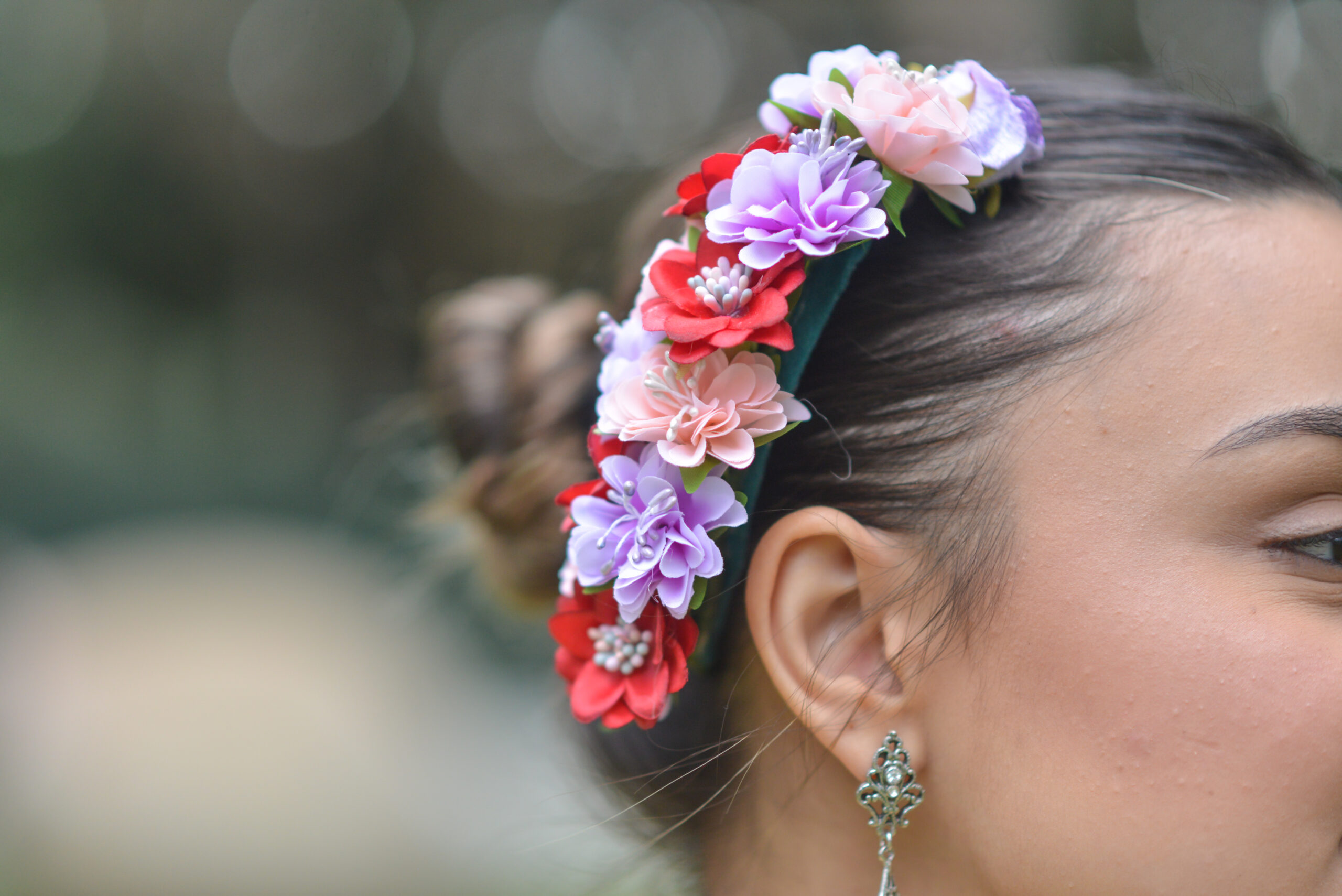 Tocado de flores tradicional, delicado y elegante, ideal para completar el traje regional